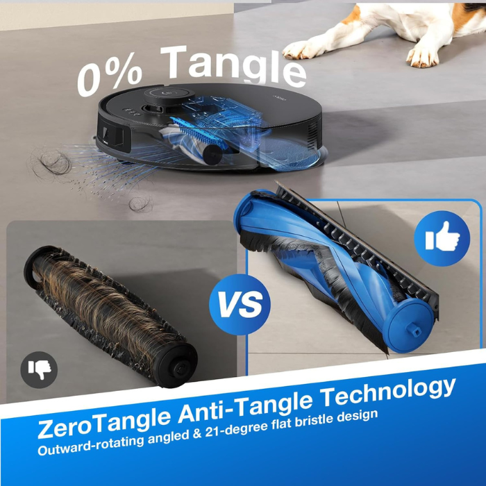 - 【Say Goodbye to Tangles and Stains】 Deebot N20 Pro Vacuum Cleaner incorporates ZeroTangle Anti-Tangle Technology, featuring a newly designed roller brush with 21° flat and outward-rotating angled bristles, along with dual comb teeth arrays, to effectively prevent hair tangling and ensure efficient cleaning, making it a pet hair nemesis and eliminating the hassle of hair entanglement on the main brush.